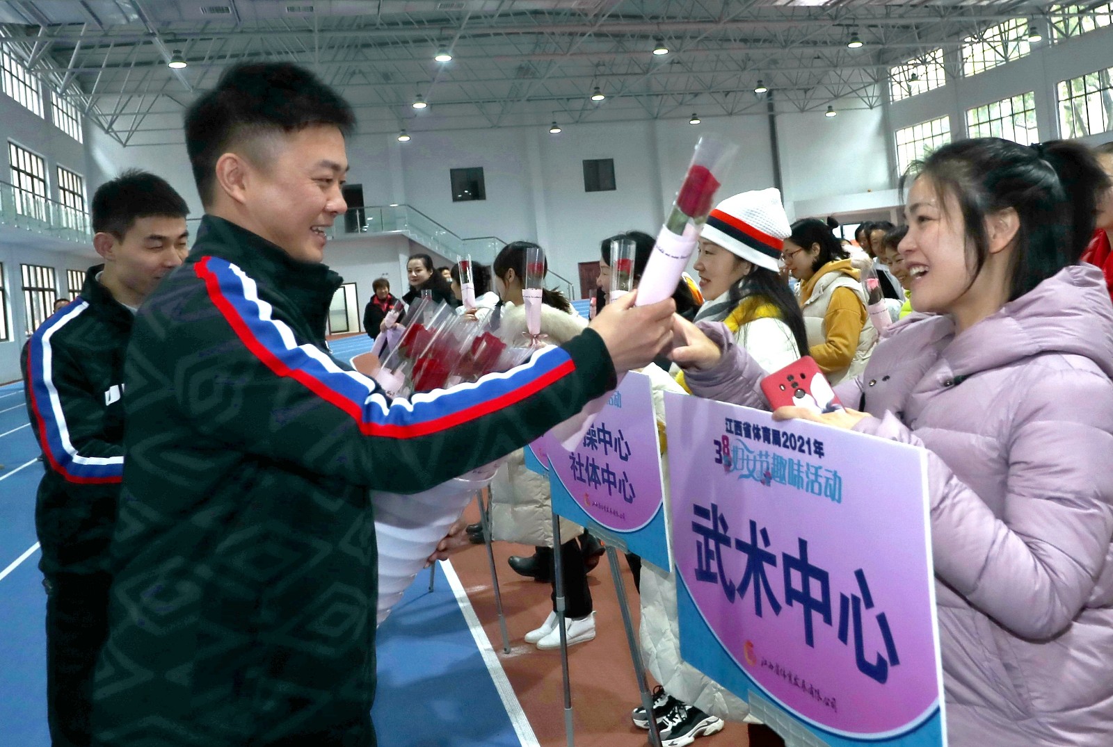 趣味賽特設(shè)暖男獻(xiàn)花環(huán)節(jié),為每一位參賽者送上鮮花,感謝她們一年來辛勤付出,為江西體育事業(yè)發(fā)展做出了積極貢獻(xiàn)。本次三八節(jié)趣味賽拓寬了省體育系統(tǒng)女干部職工的業(yè)余文化生活,團(tuán)結(jié)引領(lǐng)廣大女干部職工立足崗位、爭創(chuàng)一流,以更加飽滿的熱情參與江西體育事業(yè)大發(fā)展。
