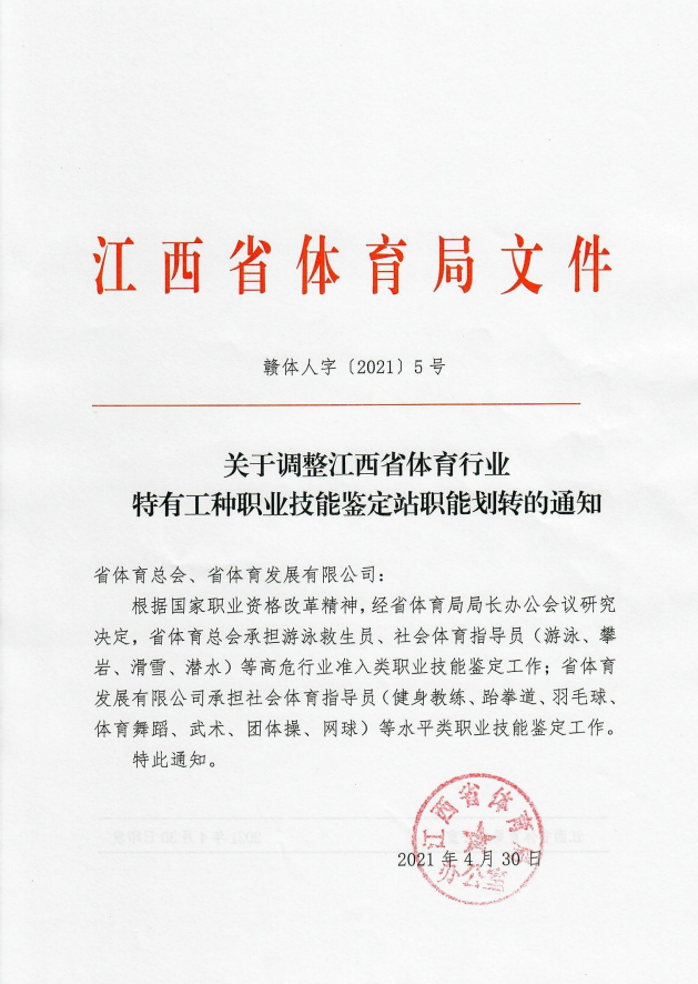 根據(jù)國家職業(yè)資格改革精神,國家體育總局職業(yè)技能指導中心于2021年1月份全國各省職業(yè)技能鑒定站發(fā)出通知,2020年底前水平評價類職業(yè)資格全部退出職業(yè)資格目錄清單。江西省體育局黨組高度重視省國家職業(yè)資格改革舉措,將體育行業(yè)水平類職業(yè)技能認定工作職能劃撥給江西省體育發(fā)展有限公司,今后省體發(fā)公司將更好的服務全省體育行業(yè)從業(yè)者。