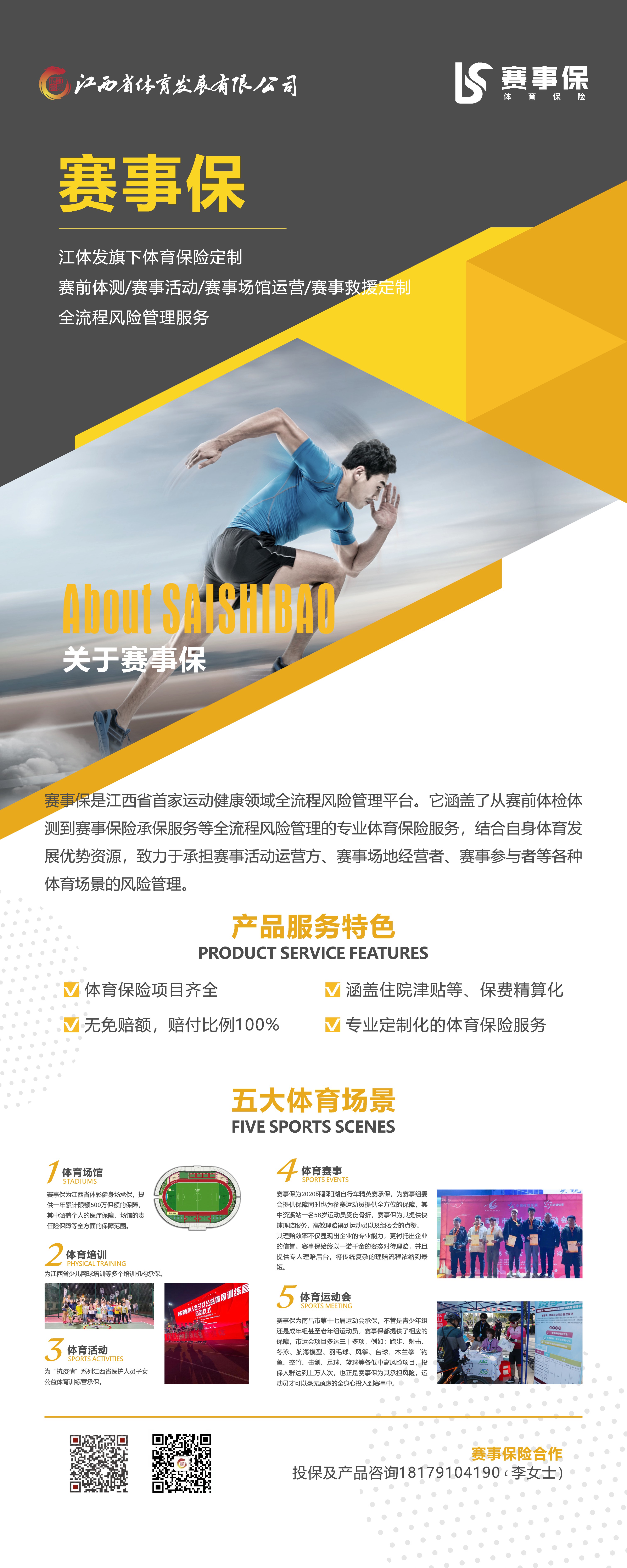 賽事保為江西體育發(fā)展有限公司旗下體育保險(xiǎn)定制,是江西省首家運(yùn)動(dòng)健康領(lǐng)域全流程風(fēng)險(xiǎn)管理平臺(tái)。涵蓋了從賽前體檢體測(cè)到賽事保險(xiǎn)承保服務(wù)等全流程風(fēng)險(xiǎn)管理的專業(yè)體育保險(xiǎn)服務(wù),結(jié)合自身體育發(fā)展優(yōu)勢(shì)資源,致力于承擔(dān)賽事活動(dòng)運(yùn)營(yíng)方、賽事場(chǎng)地經(jīng)營(yíng)者、賽事參與者等各種體育場(chǎng)景的風(fēng)險(xiǎn)管理。賽事保自成立以來,在發(fā)展體育保險(xiǎn)事業(yè)中成績(jī)斐然,為江西省體彩健身場(chǎng)、江西省第六屆全民健身運(yùn)動(dòng)會(huì)、南昌市第十七屆運(yùn)動(dòng)會(huì)、2020環(huán)鄱陽湖自行車精英賽等50多項(xiàng)賽事活動(dòng)承保,服務(wù)總保額超6億元,用專業(yè)的保險(xiǎn)服務(wù)助力體育事業(yè)的發(fā)展。